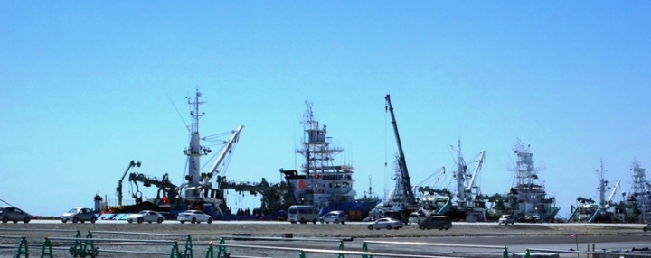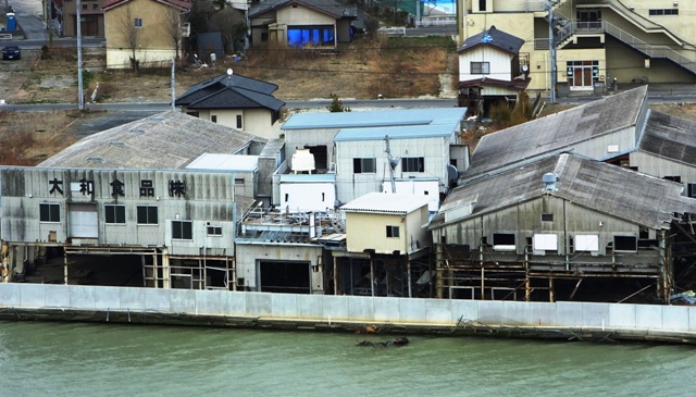 横倒しになったビルを横目に操業する漁船 |
