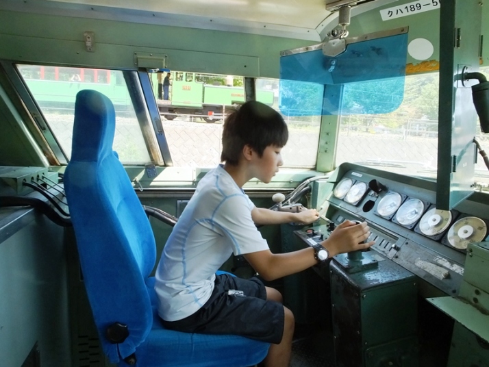 屋外展示場では旧国鉄時代からの歴史的車輌を、整備や塗装も往年の状態に復元して展示されており、碓氷峠などで活躍していた電気機関車をはじめ、蒸気機関車、ディーゼル機関車、気動車、客車がズラリと並び、そのうえ車内も見学することができ(日曜、祝祭日、8月のみ)、運転席に座り込み、専門誌などで読んだのだろう「これを動かしてこれを引くとこれを操作できるはずなんだけど…」などと目を輝かせて疑似体験を楽しんでいた。