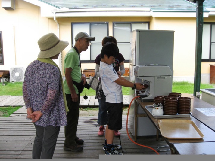 無料のかき氷まず孫に食べさせてから |