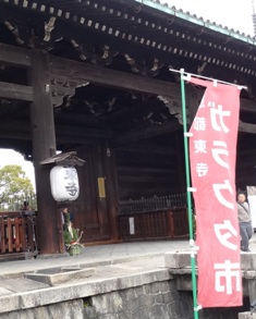 東寺の五重塔 道路を渡る歩道橋からの姿もなかなか良い 南大門の入り口にガラクタ市の旗が