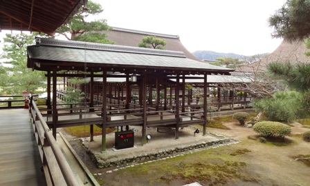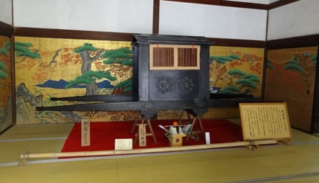 大覚寺の玄関、輿と襖絵 大覚寺村雨の廊下