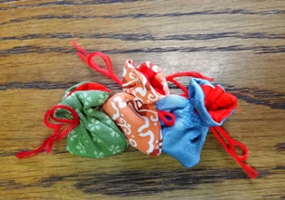 その結果、お年賀に年の初めにふさわしい縁起の良いものを・・・ ということで、端布を使って手づくりの小袋を作り、お客様に代わって鎌倉の銭洗い弁財天で清めてきた五円玉を納め、「お客様とカリーナの末永いご縁を願って」と言う意味を込め、受け取っていただこう・・・ となった。