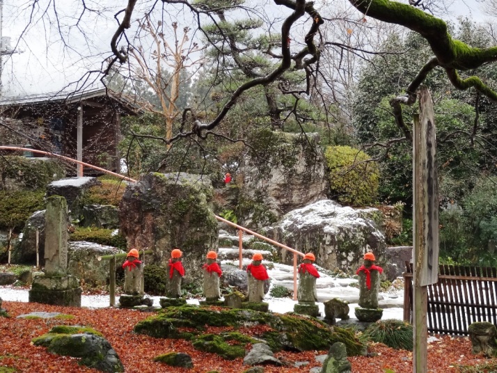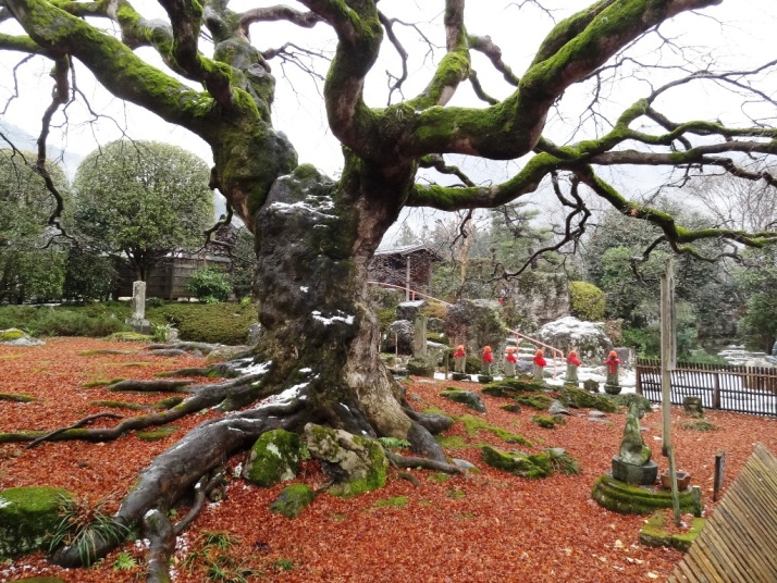 落ち葉の中にどっしりと根を張り悠然と立つ樹齢600年のもみじ、そのわきに訪れる参拝客を迎えて立つ六地蔵と朝の新雪をのせた岩。