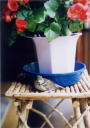 花鉢の台座はおきにいりの様子!天然のつる製がいいのか、ときおりついばんでみたり、自然観察でもしているようにのんびりしています。