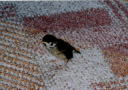静かにしてるなあ、と思って目をやるとタオルを頭に乗せた感じで(ちょうど折り重なっている部分)クリツとした丸い目でジツとこちらをみていたり、そんな時、ちょっと合図すると途端にねぐらから半身のりだして「遊んでくれエ」・・・・・といわんばかり、ものすごい元気な反応をみせます!