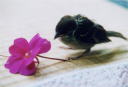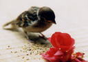カゴの水場に赤い花びらを落としておいたら、興味をもったか嘴でつついていたけど・・・・・それまで!