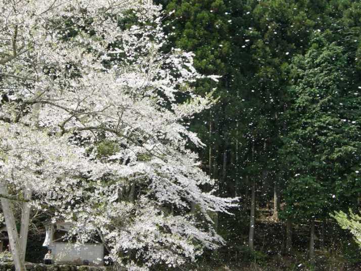 強い風に花吹雪が舞い、おのれの体をその薄墨色の花びらで装う