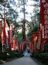 参道にずらりと並ぶ赤い鳥居と旗は祈願が成就した人が寄進したもので、その数が信仰の証しにもなるのだろう。