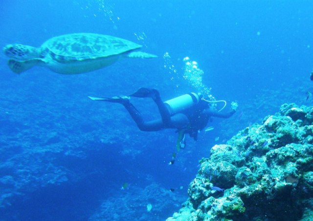 そんな謙虚さ(?)に褒美をくれたのだろうか、二本目には三度もウミガメに出会え、しかも、日頃からマナーの良いダイバーには警戒心もないのだろう、ゆったりと泳ぐその姿を追いながらしばらくの間、みんなでウミガメの仲間入りをした。